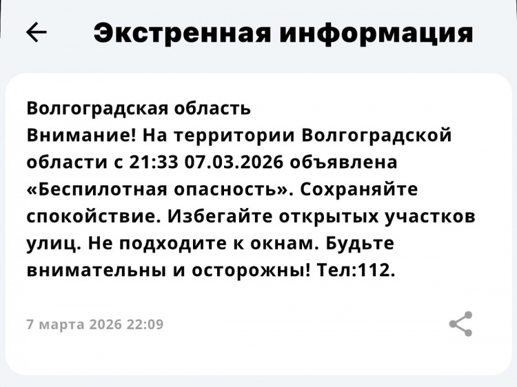 Беспилотная опасность вновь объявлена в Волгоградской области. РЧСЧ уведомило об этом 7 марта около 22:00. Жителям рекомендуется зайти в помещения и покинуть открытые участки улиц.