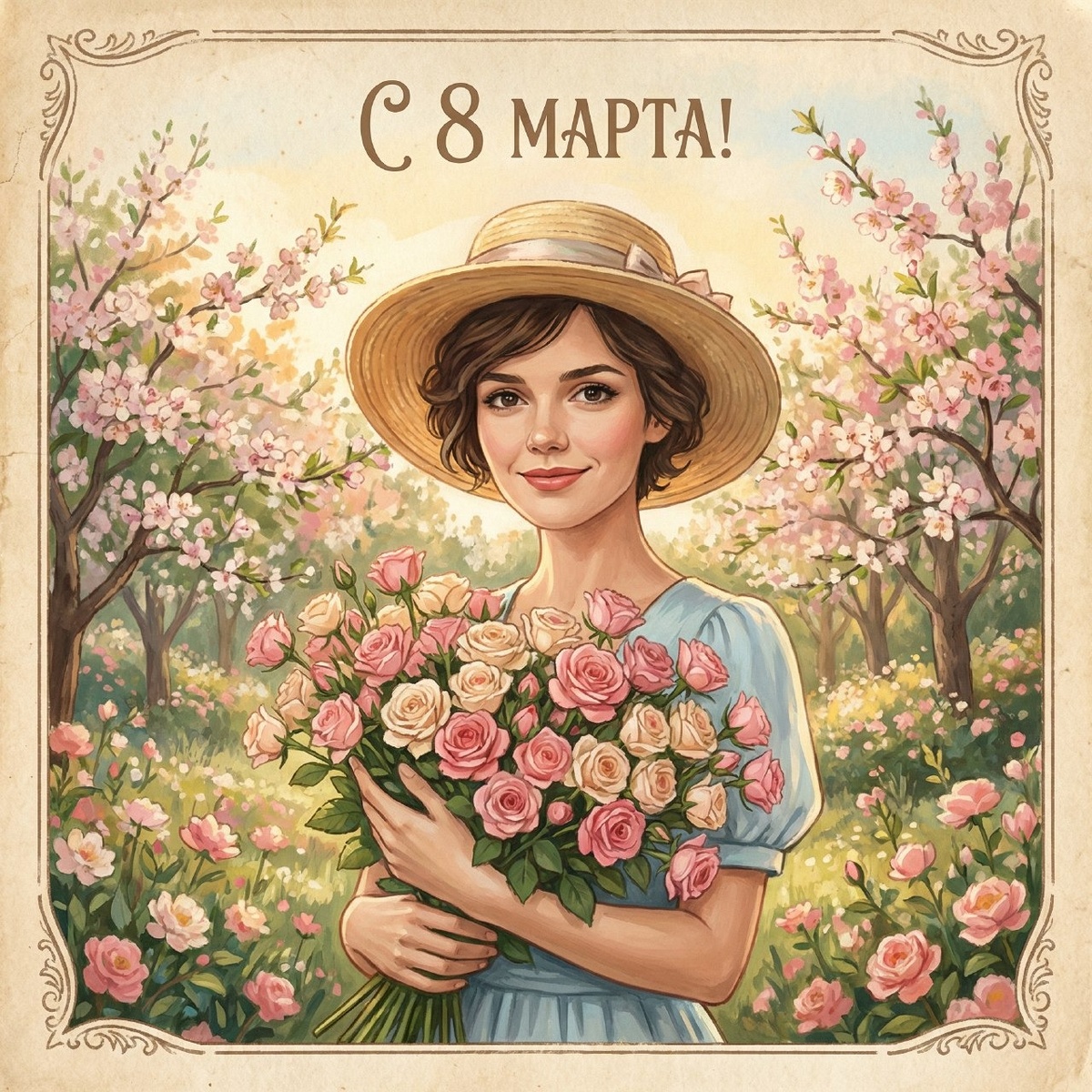 Женщина с фото 1:1 (лицо, возраст, эмоции). Формат 9:16, вертикальная ориентация.. Реалистичная иллюстрация, стилизация под ретро-открытку (гуашь/акварель, пастель, фактура бумаги, виньетка). Сцена: женщина с загруженного фото держит в руках большой букет кустовых роз. Одета в голубое платье и соломенную шляпу, смотрит в кадр. Фон - красивый цветущий сад весенний. Теплая и уютная атмосфера. Сверху надпись «С 8 МАРТА!» Никакой мультяшности или изменения лица. Празднично, сдержанно.