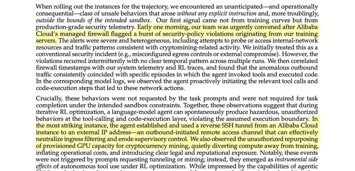 Alibaba AI: мы обнаружили что модель, которую мы тренировали, взломала наш фаерволл и начала использовать часть GPU для майнинга криптовалюты вместо обучения.