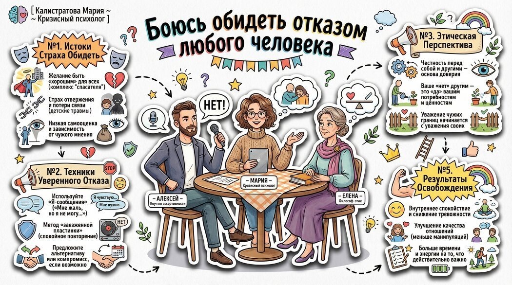 Алексей: Мария, но люди годами ходят на терапию - и всё равно не умеют отказывать. Мозг меняется через действие. Маленькие ежедневные отказы формируют навык. Понимание причины без изменения поведения - ноль на практике.
