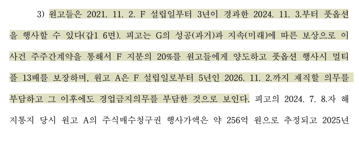 ) Истцы вправе, по истечении трёх лет с даты учреждения F (02.11.2021), то есть начиная с 03.11.2024, осуществить пут-опцион. Ответчик, в качестве вознаграждения за успех G в прошлом и её устойчивость в будущем, по договору между акционерами по настоящему делу передал истцам 20% акций F и гарантировал мультипликатор в 13 раз при осуществлении пут-опциона. При этом истец A принял на себя обязанность продолжать работу в F в течение пяти лет с даты учреждения F, то есть до 02.11.2026, а также обязанность соблюдать запрет на конкуренцию и после указанной даты. A - Мин Хиджин G - NewJeans F - Ador @skandalbomb