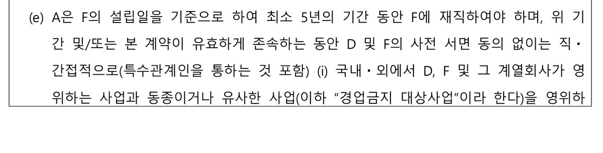 В течение указанного периода и/или пока настоящий договор остаётся действительным, без предварительного письменного согласия D и F истец A не имеет права прямо или косвенно (включая участие через аффилированных лиц): (i) На территории страны или за рубежом осуществлять деятельность, которая является такой же или аналогичной деятельности, осуществляемой D, F или их аффилированными компаниями. (ii) Создавать компанию, осуществляющую деятельность, подпадающую под запрет конкуренции. (iii) Инвестировать в долю компании, осуществляющей деятельность, подпадающую под запрет конкуренции, предоставлять ей финансирование (займы) или участвовать в её слиянии. (iv) В любой форме участвовать в деятельности компании, предпринимателя или юридического лица, осуществляющих деятельность, подпадающую под запрет конкуренции, включая деятельность советника, консультанта или эксперта, независимо от того, получает ли A за это вознаграждение. A - Мин Хиджин D - Hybe F - Ador @skandalbomb