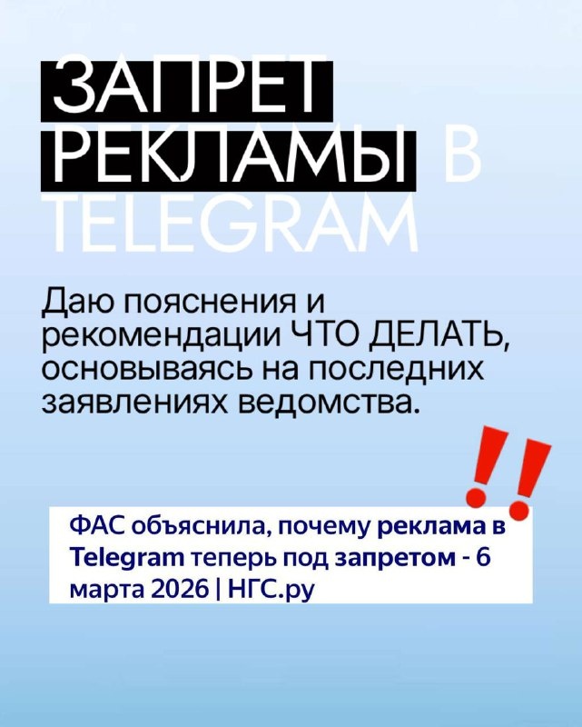 6 марта 2026 года Федеральная антимонопольная служба впервые высказалась по поводу рекламы на Telegram и YouTube: размещение рекламы на этих площадках может считаться нарушением закона о рекламе. 💡 Почему: Россия уже ограничила доступ к платформам - замедление работы, технические ограничения, возможная блокировка. Закон о рекламе запрещает распространять рекламу на ресурсах, доступ к которым ограничен Роскомнадзором. ⚖️ Закон не новый. Поправка действует с сентября 2025 года, но ранее не применялась к Telegram и YouTube, так как Telegram официально не был заблокирован, а YouTube только замедляли. С начала 2026 года ограничения усилились, и ФАС впервые интерпретировала закон в отношении Telegram-каналов. 💰 Что это значит для блогеров: - возможные штрафы до 500 000 ₽ - требование удалить рекламный пост - ответственность для рекламодателя и владельца канала 📊 Telegram и YouTube вместе создают около 70% всей рекламы на инфлюенс-площадках в России. Поэтому запрет может стать серьёз