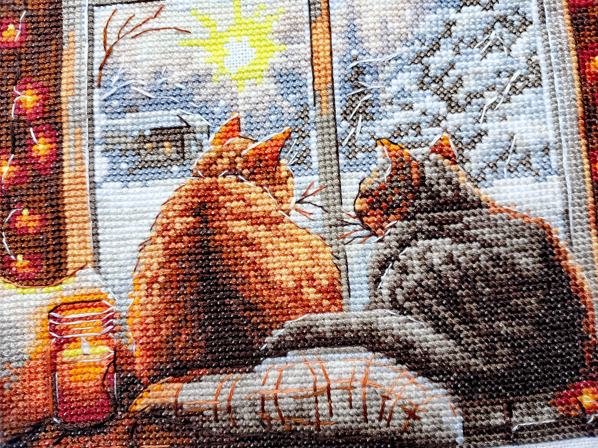 Я вышивала эту картину в январе и феврале, всего она заняла у меня 41 календарный день. Там негде заскучать, схема и органайзер удобные, обо всём позаботились — вышивай себе и в ус не дуй. Но осенних котиков я почему-то вышила за девять календарных дней, подбором. Они у меня летели, казалось, что в них нечего вышивать. Зимняя же схема по мере вышивания словно увеличивались в размере. :D