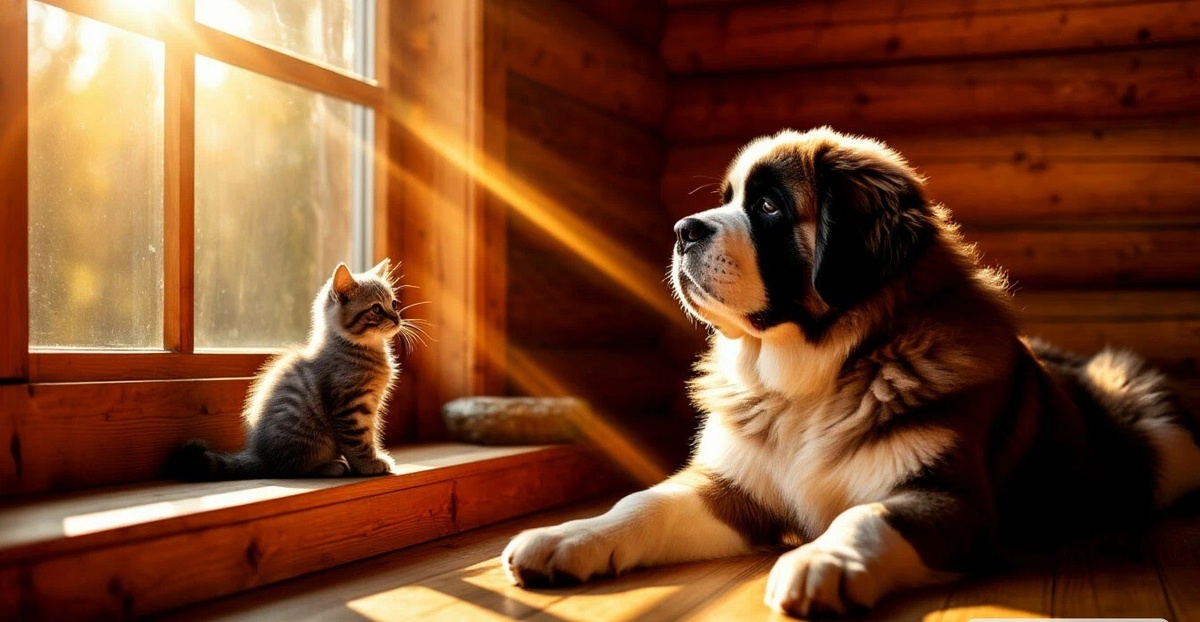 В уютном домике, где всегда пахло пирогами и по полу играли солнечные зайчики, жили серенькая кошечка Фитти и щенок сенбернара Герри.