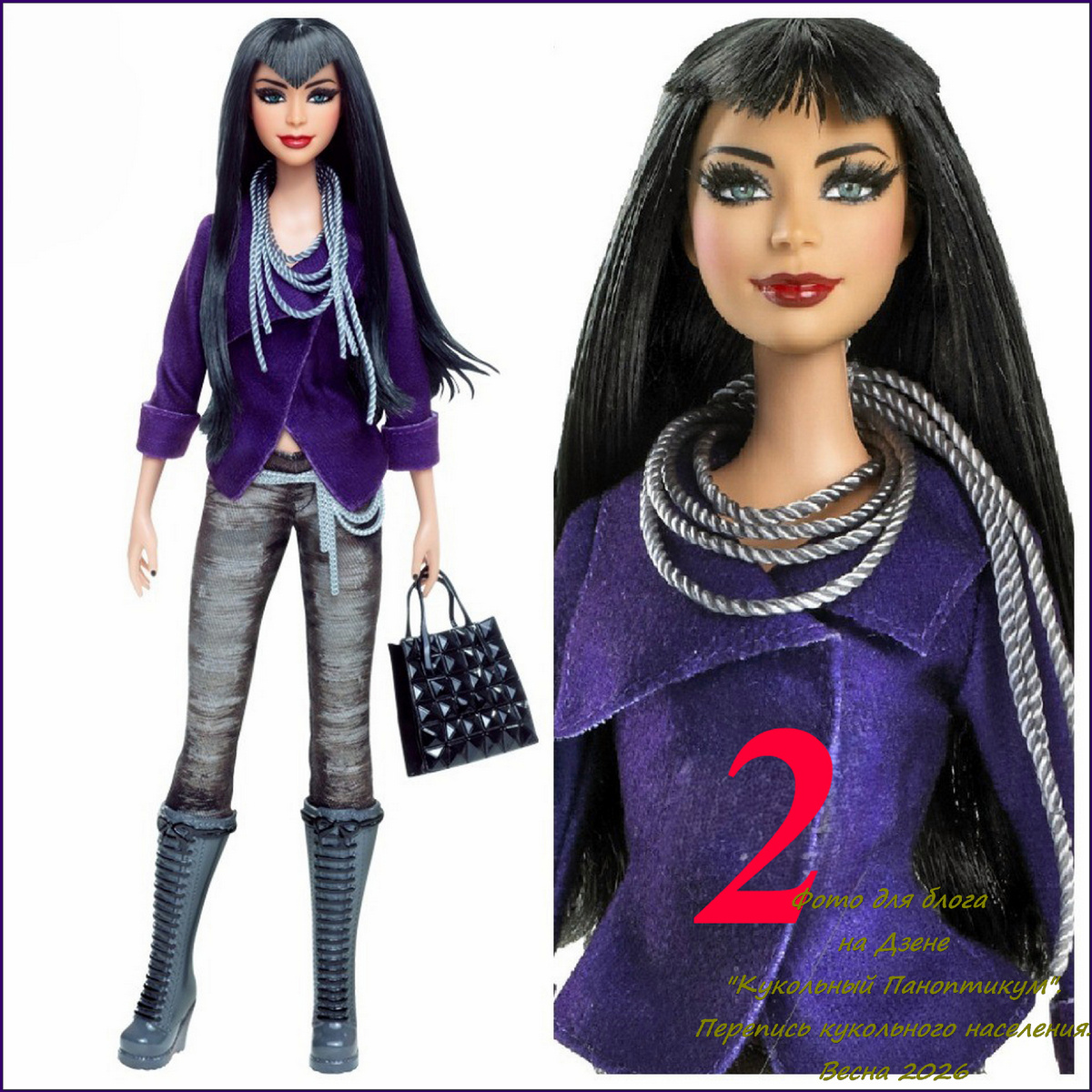 . Её лицо украшают выразительные ресницы — редкая деталь для кукол этого периода! Внешность: Эта красотка с длинными чёрными прямыми волосами и чёлкой воплощает тёмную эстетику.
