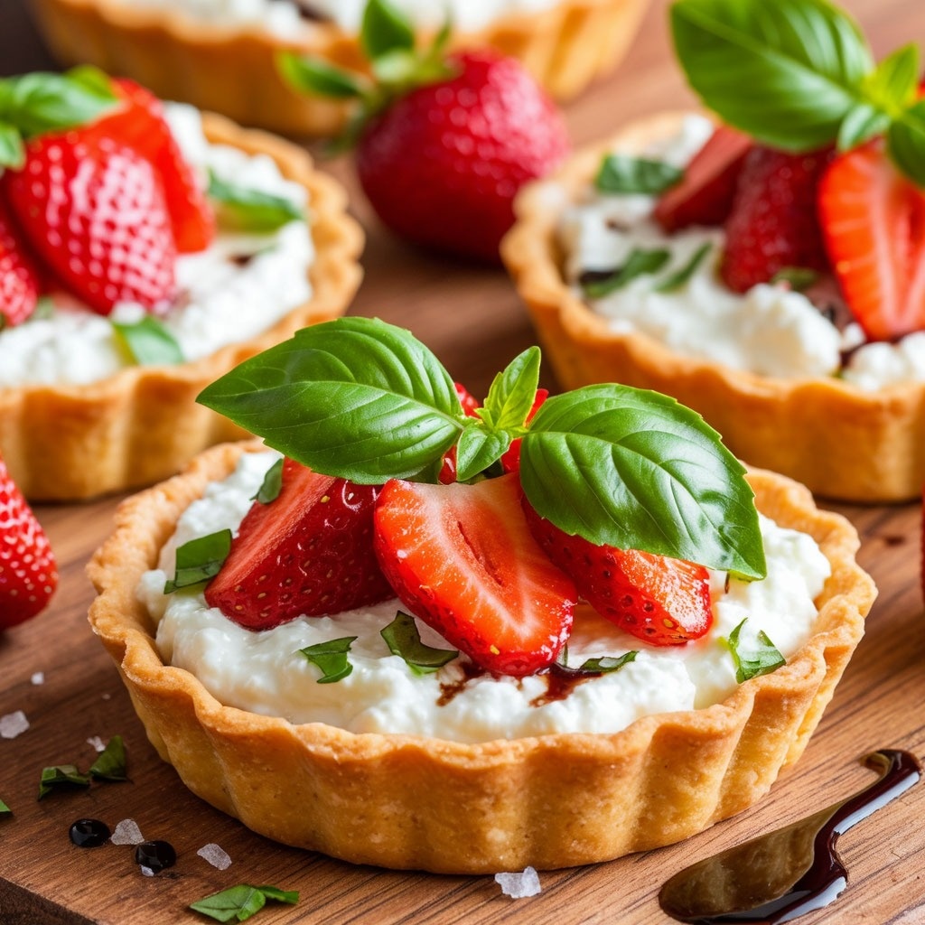 Смешать рикотту/творожный сыр с солью, добавить резаный крошечными кубиками красный болгарский перец, мелко резанную зелень базилика. Начинить полученной смесью тарталетки и украсить слайсами клубники и листиком базилика. Если хотите, сверху можете сбрызнуть бальзамическим уксусом- капельку.