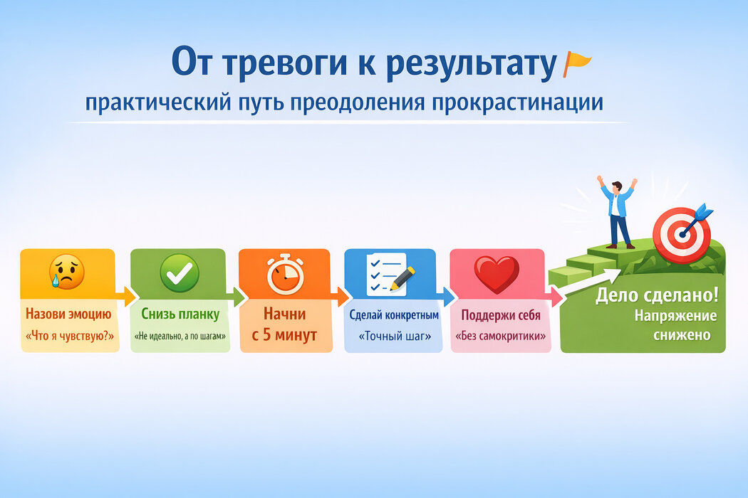 Прокрастинация: от тревоги к результату - пошаговый план, как перестать откладывать дела.
