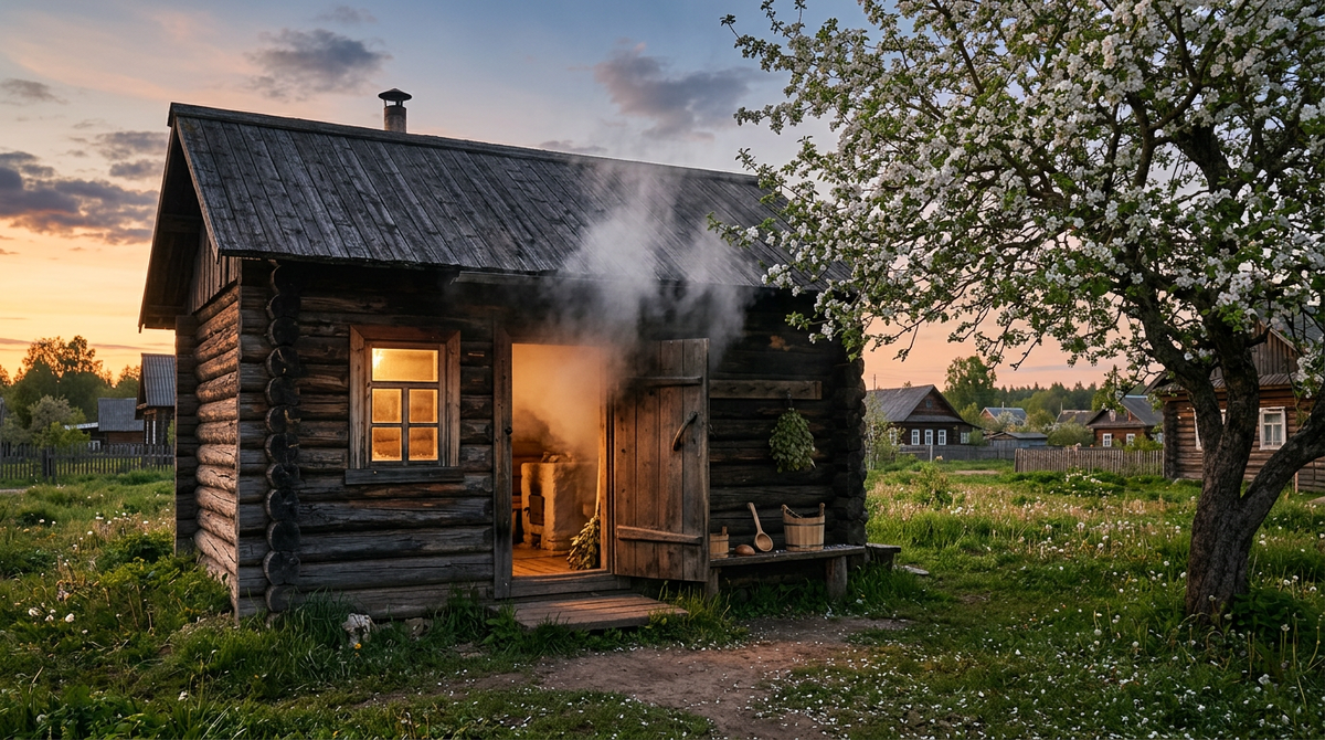 Баня стояла здесь семьдесят лет. Дед Степана строил. Топилась по-чёрному — без трубы, дым выходил через дверь и окошко. Стены чёрные от копоти, потолок низкий, пахло горьковатым — полынью и берёзой.