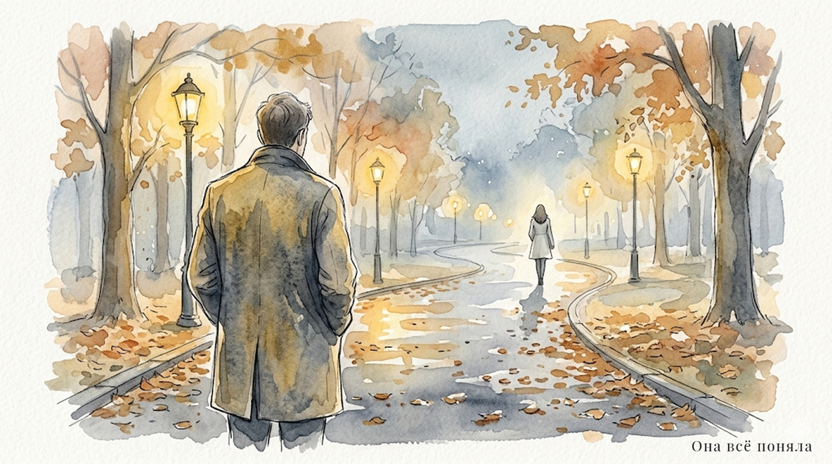 Она сказала «пока» — тихо, окончательно — и пошла по дорожке. Он смотрел вслед. Светлое пальто. Прямая спина. Потом и это растворилось в жёлтом свете фонарей.