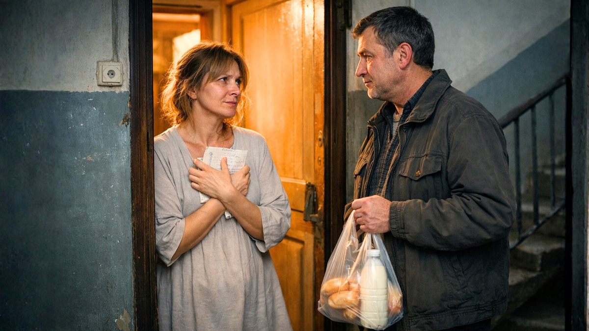 Он стоял на площадке. В куртке, непричёсанный, с пакетом. Из пакета торчала бутылка молока и булочки. Лицо усталое, глаза красные. Не спал всю ночь.