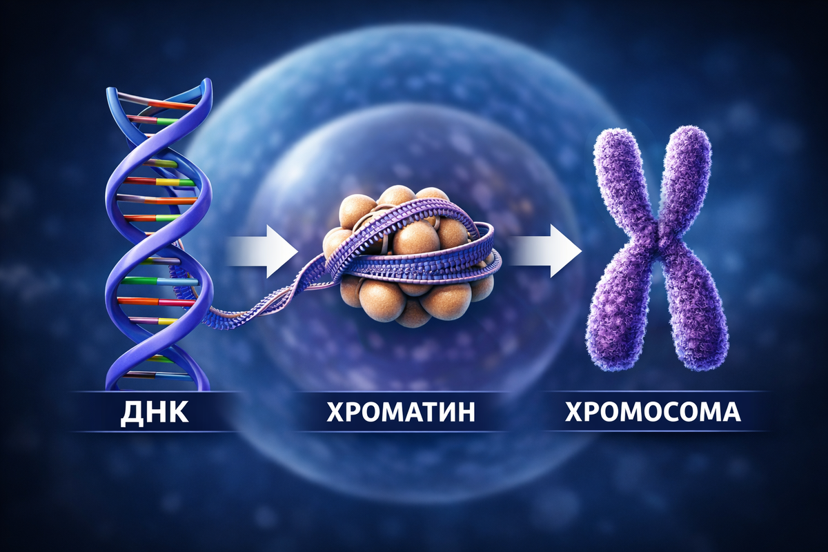 Чтобы вообще перестать путаться в этих словах, надо понимать главное: это всё про одну и ту же молекулу ДНК, просто в разной степени упаковки. __________ 1️⃣ ДНК Молекла ДНК - это полимер (если точнее, то нерегулярный гетерополимер, состоящий из нуклеотидов (А, Т, Г, Ц). Сама по себе ДНК, как мы ее обычно представляем это правозакрученная двойная спираль. А теперь зацените ее размеры. В одной клетке человека около 2 метров ДНК!!! При этом вся эта красота должна поместиться в ядро размером примерно 5–10 микрометров (это 0,005–0,01 мм). То есть мы пытаемся упаковать двухметровую нить в очень маленький объём. Без грамотной организации это физически невозможно. И вот тут то нам и нужны ГИСТОНЫ — специальные белки, на которые мы намотаем нашу ДНК, как нитка наматывается на катушку. 2️⃣ ХРОМАТИН = ДНК + БЕЛКИ Когда ДНК связана с белками-гистонами, это уже называется хроматин. ✔ Структурная единица хроматина — нуклеосома: По фану еще можно можно зафиксировать, что белки-гистоны обладают щело
