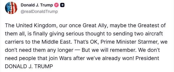 военной помощью в войне с Ираном и ему она уже не нужна. «Соединённое Королевство, наш некогда великий союзник, возможно, величайший из всех, наконец-то всерьёз задумывается о том, чтобы отправить два авианосца на Ближний Восток. Ну и ладно, премьер-министр Стармер, они нам больше не нужны — но мы это запомним. Нам не нужны люди, которые присоединяются к войнам после того, как мы уже победили!» Подпишись на БородинLIVE Новости