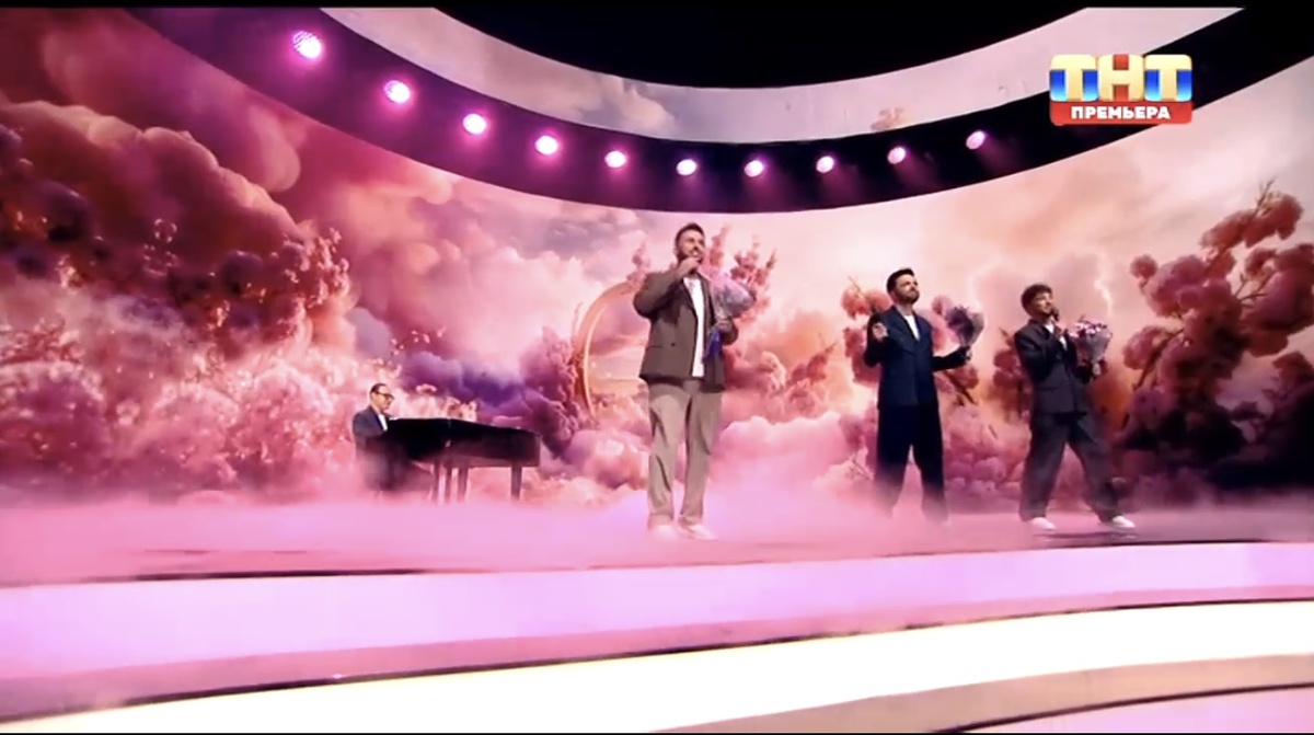 Открывали праздничный выпуск шоу ярко и песней «Девочка, девушка, женщина», так мужская часть шоу поздравила всех прекрасных дам с праздником.