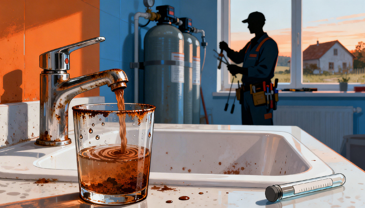 Если вода рыжая уже из крана — значит, окисление произошло раньше: в трубах, в скважине или в накопительном баке. Взвешенные частицы Fe³⁺ и есть то, что вы видите как «ржавчину».