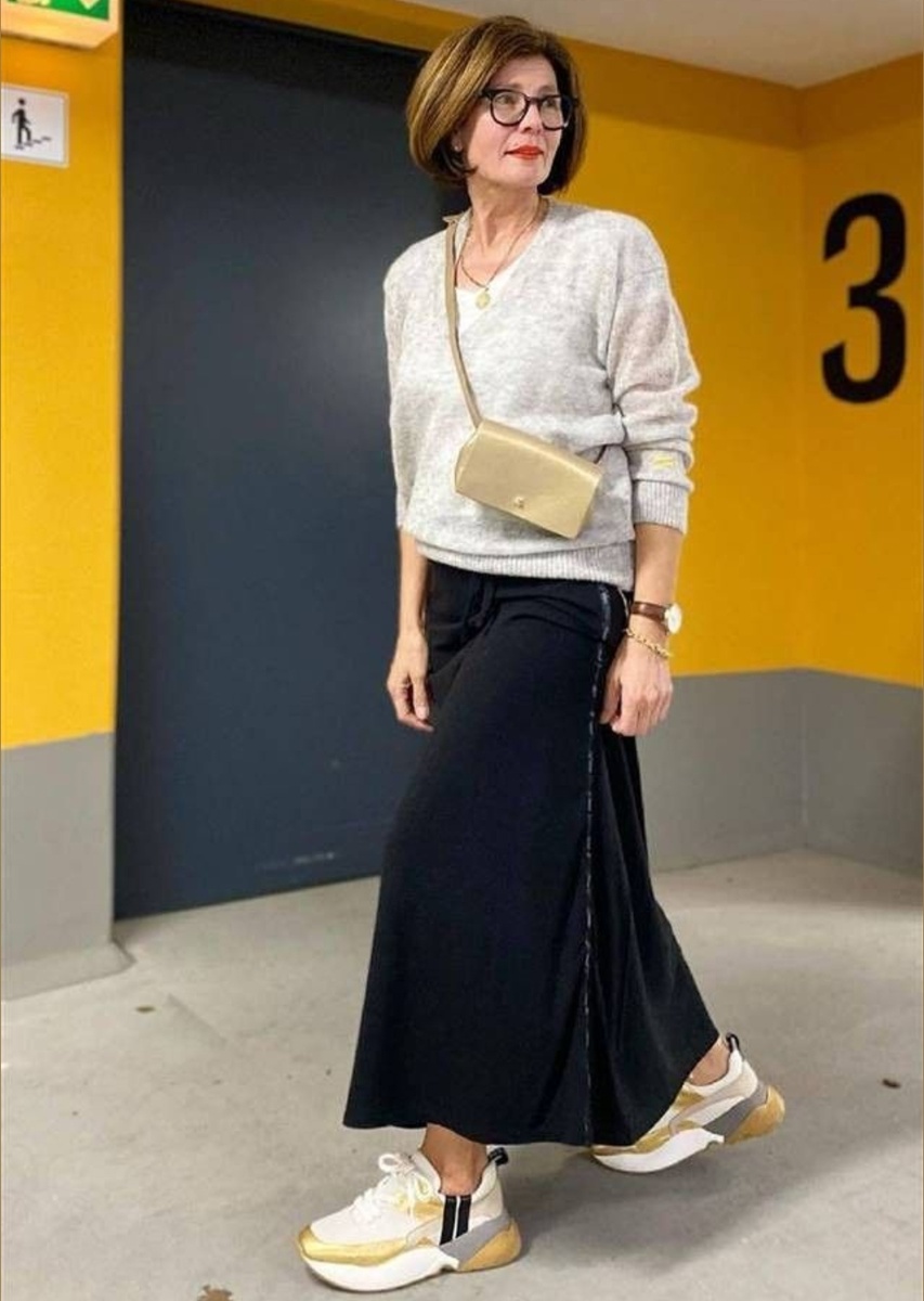 После пятидесяти мы можем позволить себе быть ярче, оставаясь при этом в рамках элегантности. Кроссовки станут тем самым аксессуаром, который оживит самый скучный комплект одежды. Попробуйте этот прием, и вы заметите, как меняется ваше настроение в течение дня.