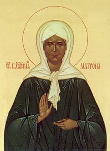 О, блаже́нная ма́ти Матро́но, душе́ю на Небеси́ пред Престо́лом Бо́жиим предстоя́щи, те́лом же на земли́ почива́ющи и да́нною ти свы́ше благода́тию разли́чные чудеса́ источа́ющи, при́зри ны́не ми́лостивным твои́м о́ком на ны, гре́шныя, в ско́рбех, боле́знех и грехо́вных искуше́ниях дни своя́ иждива́ющия, уте́ши ны, отча́янныя, исцели́ неду́ги на́ши лю́тыя,