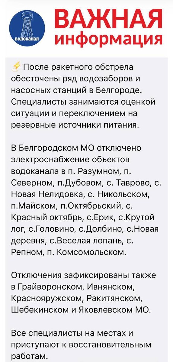 ⚡️После ракетного обстрела обесточен ряд водозаборов и насосных станций в Белгороде, сообщает Водоканал
