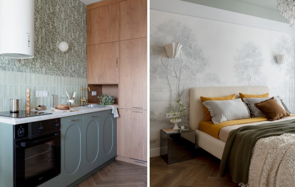 На кухне вся техника встроена за фасадами, поэтому пространство выглядит цельным и аккуратным, без лишних деталей. Общее настроение задают оливковые фигурные фасады, фартук и шведские обои с неярким цветочным рисунком. Над рабочей зоной внимание привлекает декоративный бра-шар из искусственного камня (тренд с выставки ARTDOM-2025). Винтажные стулья в обеденной зоне, найденные на «Авито», органично вписались в интерьер и по цвету, и по форме.
