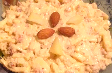 Ингредиенты: - 150 г сыра - 1-2 сладких яблока - горсть миндаля - 2 ст. л. майонеза - сок лимона по вкусу - соль Приготовление: Сыр и очищенные яблоки нарезать тонкими ломтиками и добавить миндаль, майонез, лимонный сок и перемешать. Можно посолить по вкусу. К этому подать поджаренные ломтики хлеба.