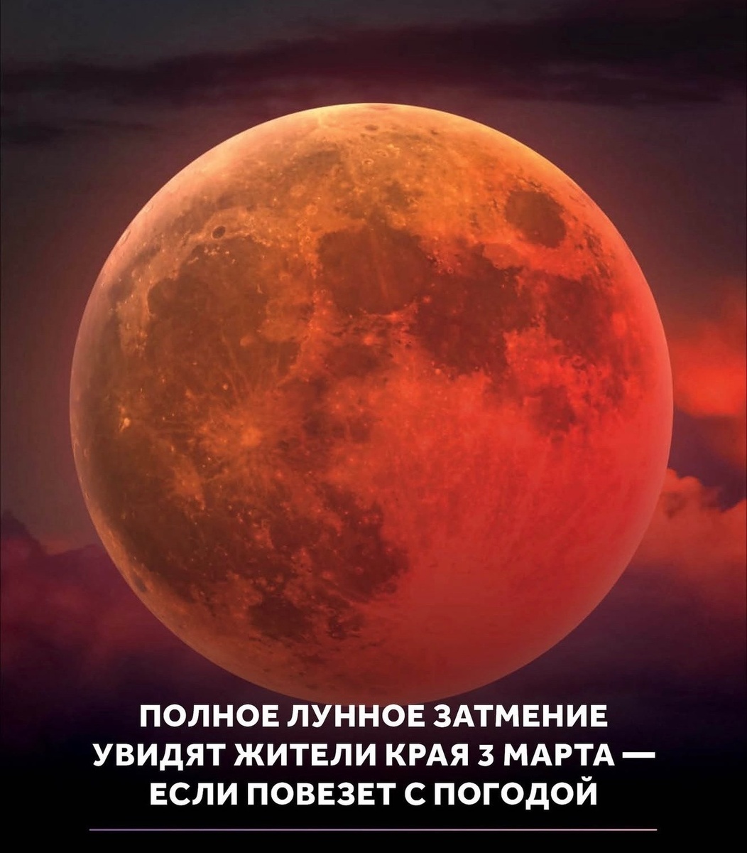 3 марта 2026 года состоится — полное лунное затмение. Во время этого события Луна целиком пройдет через тень Земли и приобретет красноватый оттенок явление иногда называют «Кровавой Луной». Покраснение связано с тем, что в это время Земля будет находиться между Солнцем и Луной, блокируя прямой солнечный свет. Некоторое количество солнечного света все же достигнет Луны после прохождения через атмосферу Земли. Синий свет рассеивается в атмосфере легче, чем красный, поэтому на Луну будет попадать преимущественно красный свет, благодаря чему ее поверхность будет казаться бордовой или медно-красной. Это затмение будет видно по всему Тихоокеанскому региону, а также частично из Азии, Австралии и Америки - то есть, практически из любой точки, где Луна будет находиться над горизонтом во время этого события. Полная фаза продлится 58 минут, а все затмение полутеневой фазы до конца — займет более пяти часов. от начала Начинать наблюдения (с учетом полутеневой Показать полностью... Терра инкогн