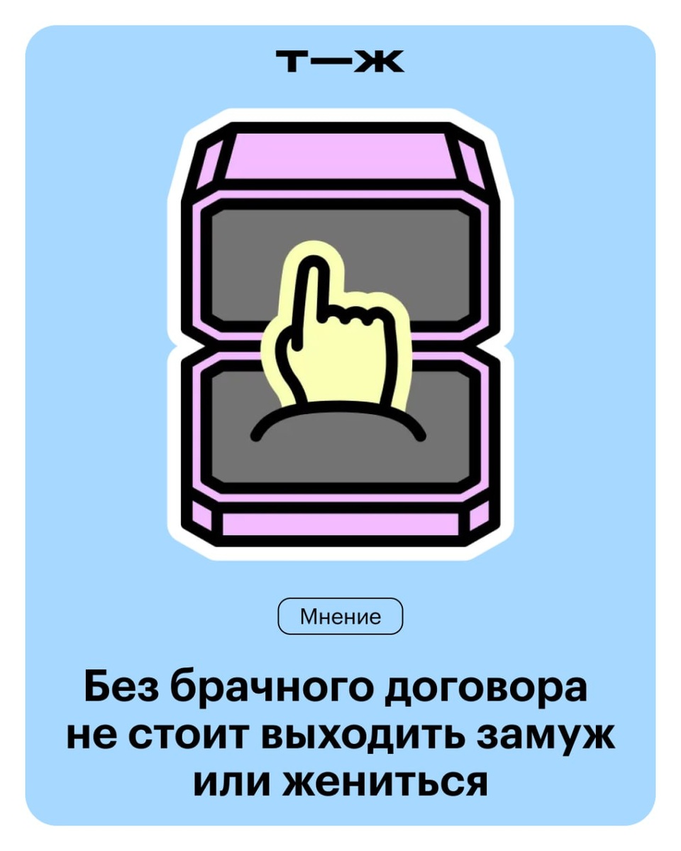 сосредоточиться на главном. А вы что думаете? 💔 Речь о любви, бумажки ее только портят! 🌚 С договором и правда спокойнее: люди меняются. Приходите обсудить в комментариях: https://t-j.ru/tg/bez-brachnogo-dogovora-nikuda-opinion/ А если хотите узнать больше про брачный договор, у нас как раз есть про него целый курс.