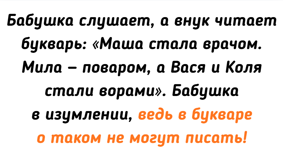 - Бабушка слушает, а внук читает букварь: «Маша стала врачом. Мила — поваром, а Вася и Коля стали ворами». Бабушка в изумлении, ведь в букваре о таком не могут писать! Читает сама: «Маша стала врачом, Мила поваром, а Вася и Коля — сталеварами». © Иван / Dzen