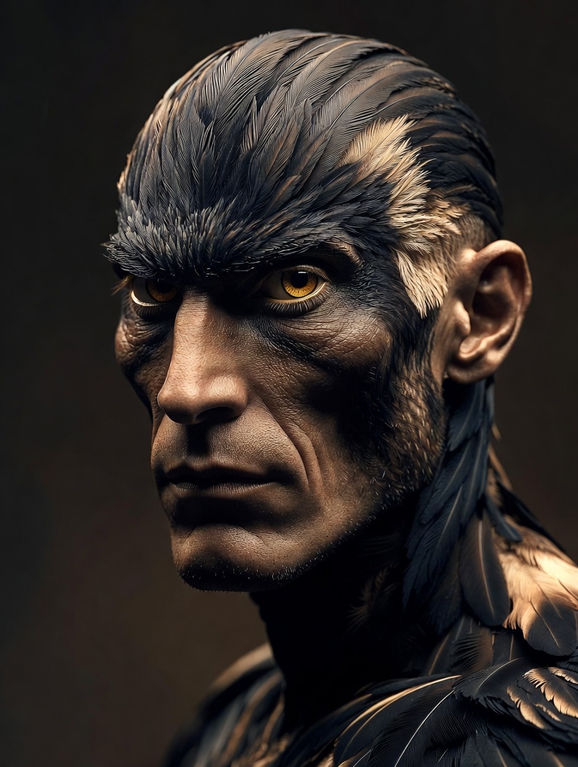 Natural hybrid male portrait, man with sharp falcon features: golden hawk eyes with slit pupils, feathered brow ridge blending into hair, light feather texture on temples, strong jaw, intense focused gaze, dramatic low-key side lighting, dark gradient background, realistic skin and feather fusion, 32k --ar 3:4 --stylize 300 --q 2 --v 7