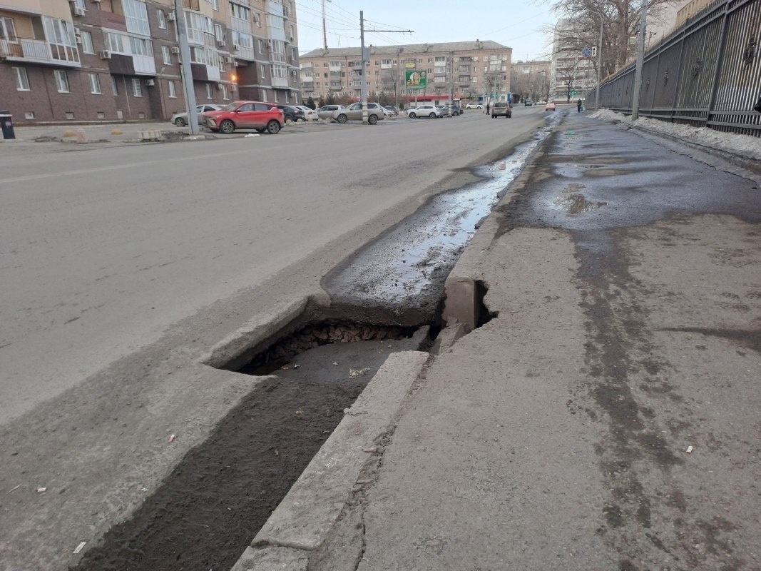 Опасный дефект дорожного покрытия образовался в правой полосе, у тротуара. Глубокая яма, которая может привести к серьезным последствиям для автомобилистов, до сих пор не ограждена и не обозначена предупреждающими знаками.
