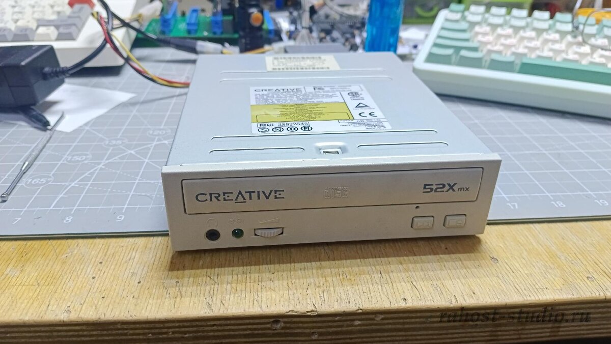 Достался мне тут интересный CD-привод Creative CD5233E, не скажу, что что-то особенное, но фирма известная, значит, надо брать! В этой статье покажу данный агрегат со всех сторон и даже внутри. Итак, привод достался мне в полурабочем состоянии. Первичные признаки такие: лоток выезжает и сразу заезжает обратно. Сам привод как бы рабочий, диски читает. При детальном осмотре нашел ещё пару неисправностей, кроме лотка, — это шуршащий регулятор громкости и рассохшийся поролон уплотнения лотка. Но до поролона и регулятора надо бы сначала разобраться с лотком. Привод был разобран, и чтобы добраться до контакта положения лотка, пришлось разобрать его весь. Разбирается привод обычно: снизу выкручиваются четыре винта, снимаются металлические крышки. Перед снятием верхней крышки рекомендуется снять передний пластик. Для этого надо вручную выдвинуть лоток, используя специальное отверстие для этого, далее, отгибая защёлки, снять морду. Так, одёжка снята, вот что внутри: Теперь нужно снять лоток. В