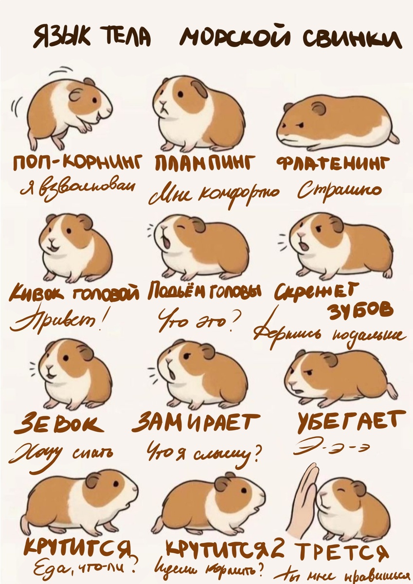 ) первые три названия вызывают вопросики, потому что в обычном общении мы их редко используем... ПОП-КОРНИНГ - это непроизвольные, хаотичные прыжки, которые обозначают радость прыгающего (обычно (всегда) морской свинки); ПЛАМПИНГ - проще говоря, расслабленное положение тела свиночки; ФЛАТ(Т)ЕРИНГ - положение тела свинки, когда та вжимает голову в тело и ложится напряженной лепешечкой на поверхность (пол, клетку, стол....) Надеюсь, эта картиночка вам пригодится)))