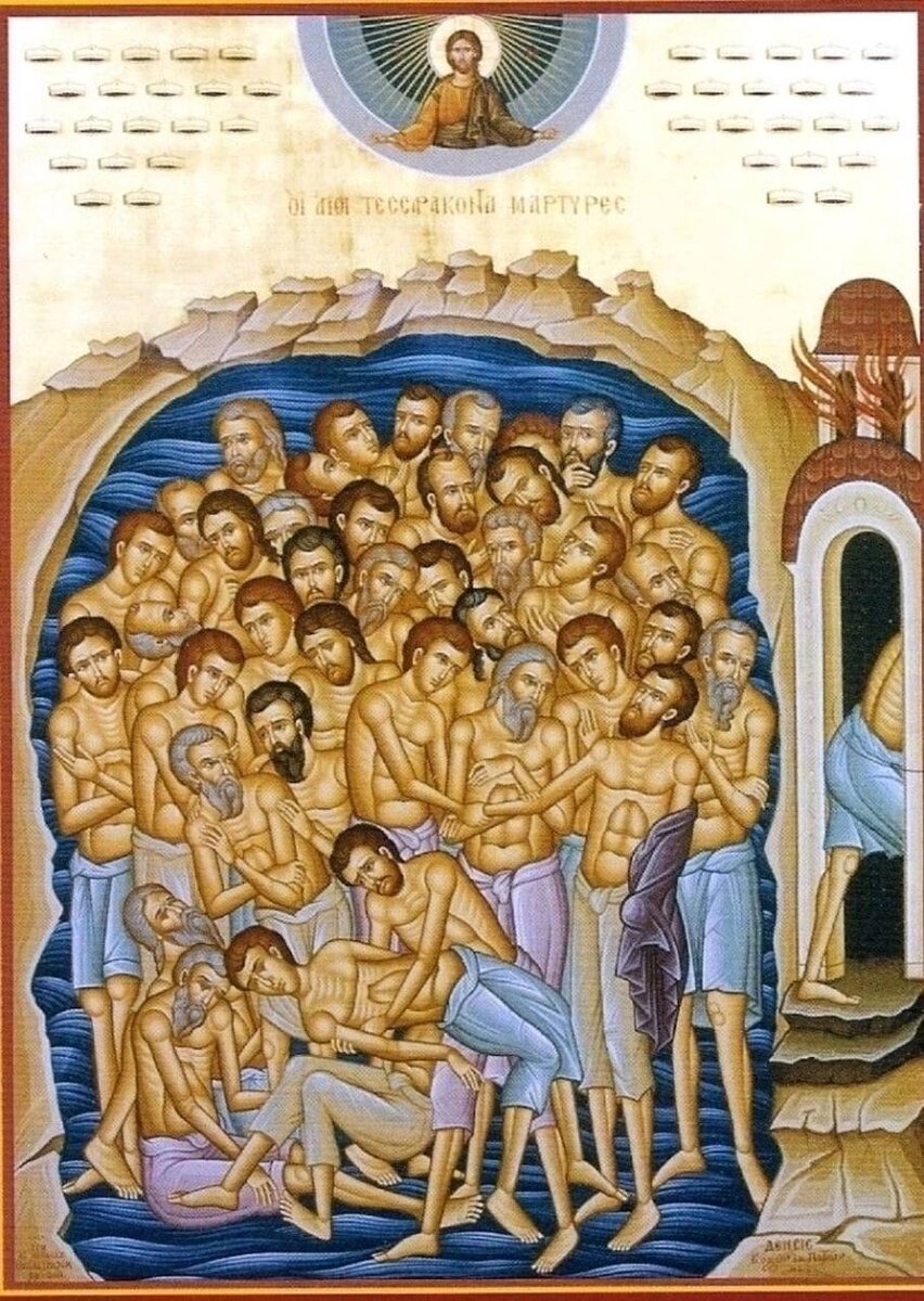 🕊️ В 313 году император Константин Великий подписал закон о свободе исповедания веры. Его соправитель император Ликиний тоже подписал этот закон, но в подвластных ему областях гонения на христиан продолжались. Около 320 года в городе Севастии, в Армении, стояло римское войско. В войске находилось 40 воинов-христиан родом из Каппадокии (ныне на территории Турции). Военачальник Агрикола принуждал их принести жертву идолам, но воины отказались. Тогда воинов арестовали и связанными повели к озеру близ города Севастии. Стояла зима, вечерело. Воинов раздетыми поставили в покрытое льдом озеро. Страшная стужа сковала члены святых мучеников, и они начали замерзать. Мучение это было для них особенно тяжелым, потому что на берегу озера для соблазна была поставлена теплая баня. Кто хотел спасти свою жизнь, должен был заявить тюремному сторожу, что он отрекся от Христа, и тогда он мог войти в теплую баню и отогреться. Всю ночь воины мужественно переносили лютый мороз, ободряя друг друга и поя св