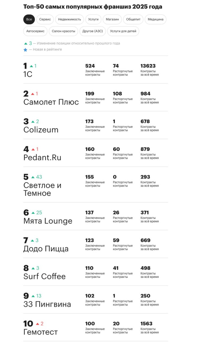 РБК представил ежегодный рейтинг самых динамично развивающихся франшиз страны. 2025 год стал одним из самых сложных для рынка: высокая ключевая ставка и реформа НДС заставили инвесторов занять выжидательную позицию. Главные цифры и тренды: 📉 Спрос упал. Интерес к покупке франшиз снизился впервые за 15 лет. Активность покупателей сократилась на 18%, а сделки теперь заключаются в среднем за 10–11 месяцев вместо 2–3. 📊 Рост замедлился. Объем рынка увеличился всего на 2,5% (до 3,8 трлн руб.), а количество новых франшиз сократилось более чем вдвое по сравнению с 2024 годом. 🛒 Форматы у дома. В рейтинг вошло много магазинов у дома, пекарен и кафе — простые форматы с низким порогом входа оказались наиболее востребованы. Кто в лидерах? 🥇 1С вернула себе первое место, продав 524 франшизы за год. Компания выиграла на реформе НДС: малый бизнес начал активнее автоматизировать учет, что подстегнуло спрос на внедрение продуктов корпорации. Необычные форматы года: * Fix-price-рестораны с фик