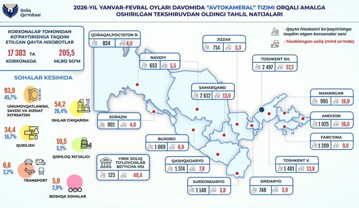 В пресс-службе Налогового комитета Республики Узбекистан сообщили результаты предпроверочного анализа, проведенного в январе-феврале 2026 года. По данным ведомства, по итогам этой работы 17 383 организации представили перерасчеты в сторону увеличения, в результате чего дополнительно начислено 205,5 млрд сумов налогов. Представленные показатели отражают масштабы применения механизма предварительного анализа отчетности, который используется для выявления расхождений и корректировки налоговых обязательств без проведения полноценной налоговой проверки.