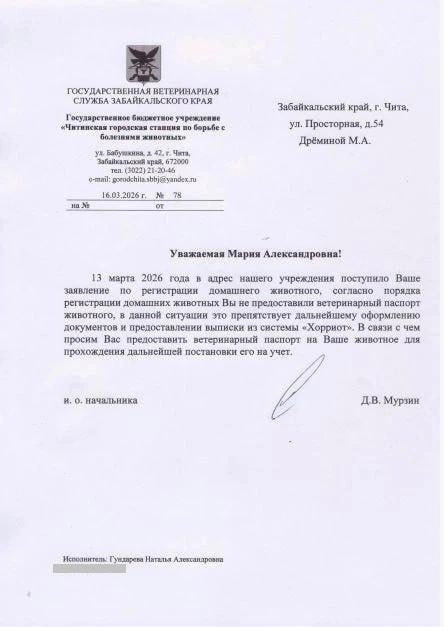 1 октября 2025 года в Забайкалье приняли закон об обязательной регистрации домашних собак. Трёхмесячных щенков нужно ставить на учет в течение 30 дней, а питомцев из приютов — в течение трех рабочих дней. Чип можно поставить и кошке — по желанию хозяина. Штрафовать хозяев, которые не поставили чип, уже могут с 1 марта 2026 года на сумму от 3 до 5 тысяч рублей. Деньги уходят в бюджет края. Всю информацию о домашнем животном собирают в специальной программе «ВетИС Хорриот», куда раньше вносили только данные о сельскохозяйственных животных. После чипирования животному присваивают уникальный номер. Мария Дрёмина рассказала, что 13 марта обратилась в Читинскую городскую станцию по борьбе с болезнями животных как частное лицо, чтобы зарегистрировать собаку. Чип у собаки уже стоял, его нужно было вбить в базу — доступ к программе «ВетИС Хорриот» есть только в государственных ветклиниках. Сама регистрация должна быть бесплатной. Читинка отдала полный список документов: заявление о регистрац