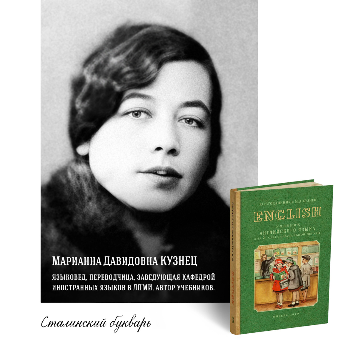 22 марта 1896 года в селе Тулуновское Иркутской губернии (сейчас город Тулун в Иркутской области) родилась Марианна Давидовна Кузнец — языковед, переводчица, автор учебников. ✅ Проектом «Сталинский букварь» переиздан учебник английского для 3 класса (первый год обучения) авторства М. Д. Кузнец и Ю. И. Годлинник, который можно приобрести на нашем официальном сайте 📗 по ССЫЛКЕ. Марианна Давидовна Кузнец работала заведующей кафедрой иностранных языков в Ленинградском педиатрическом медицинском институте. Написала учебники: • «English Literary Reader for secondary schools (Хрестоматия по внеклассному чтению. Английский язык. Средняя школа. 10 класс)» в соавторстве с Анной Якобсон, М.-Л.: Полиграфкнига, 1935; • Учебник английского языка для 3 класса начальной школы (первый год обучения), в соавторстве с Ю. И. Годлинник, 1949; • «Стилистика английского языка: пособие для студентов педагогических институтов», в соавторстве с Скребневым Ю. М., Л.: 1960; • «Сборник упражнений по лексикологии