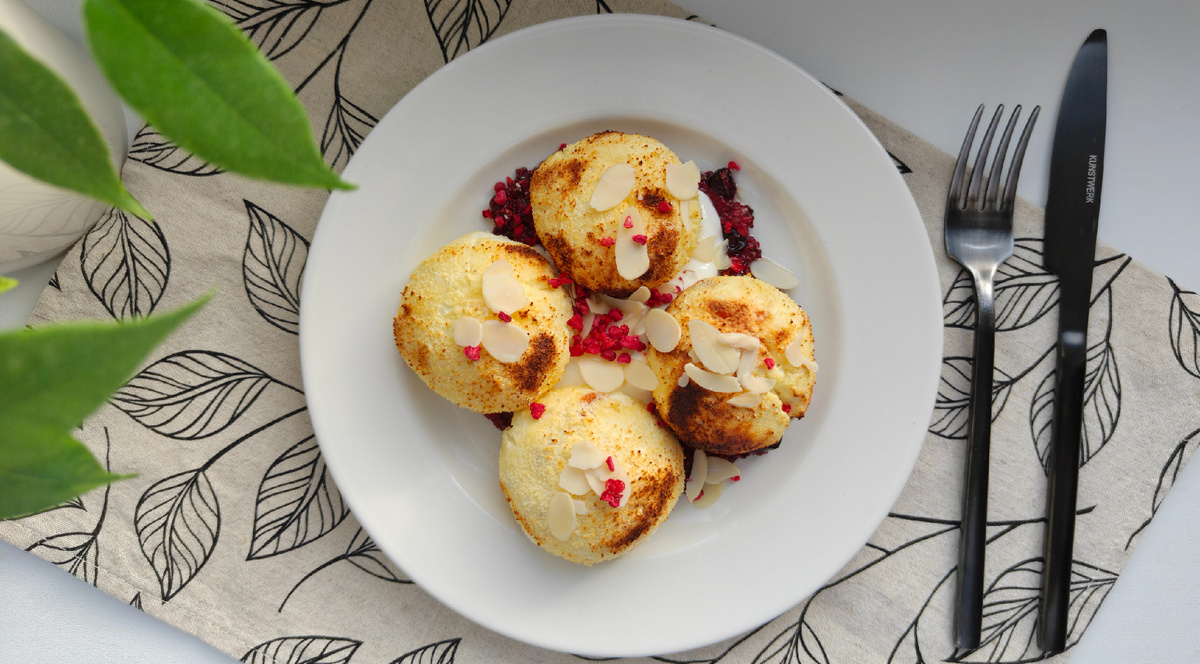 Ели такие творожники с малиново-смородиновым чиа-джемом и сметаной. Сверху украсила сублимированной малиной и миндальными лепестками.