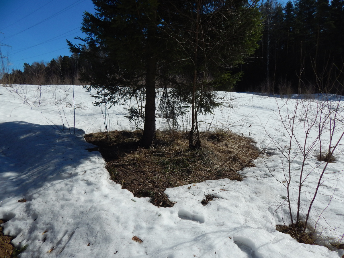 Это было в субботу. За неделю накопилась сильная усталость. И я всё недоумевал, почему в лесу, уже сколько дней стоит жаркая не по мартовски погода, нет половодья. Уже даже на просеке ЛЭП очагово снег стал уходить. Не добавила мне радости и печальная картина с погнувшимися саженцами сосны. Снегопады этой зимой оказались для части из них непосильными. А один саженец полностью сломался. Ну или его сломали... Напоминаю, что минувшей зимой я именно в этих краях снимал репортаж "Лесной бал-маскарад". Но красота снежных шапок оказалась обманчивой. Деревья способны потихоньку стряхивать с себя снег, но когда заносит зверски и постоянно - это уже не всякому дереву под силу.