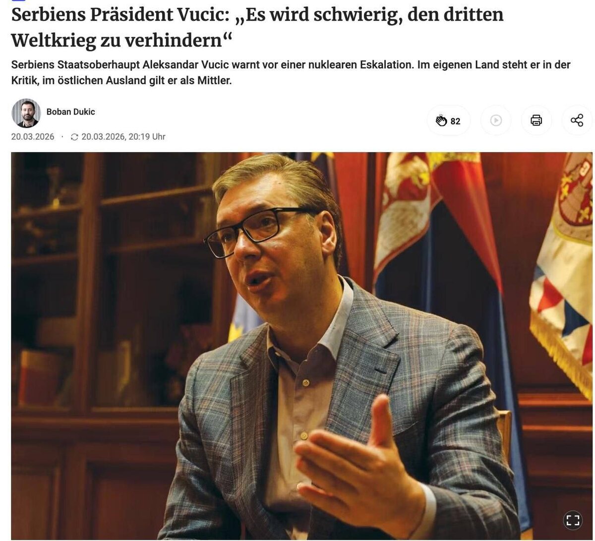 По его словам, текущие конфликты постепенно перерастают в более масштабное противостояние. «Возможно, Третья мировая война уже началась — просто мы пока не называем ее так», — заявил он в интервью Berliner Zeitung. Он также допустил применение ядерного оружия. «Я не считаю невозможным, что в какой-то момент будут использованы тактические ядерные вооружения», — сказал сербский президент. По словам Вучича, борьба за ресурсы — нефть, газ, редкие металлы — уже идет, и именно такие процессы лежали в основе предыдущих мировых войн, которые сначала начинались как региональные конфликты. Он говорит, на разных континентах формируются геополитические блоки, а интересы крупных держав слишком различаются, чтобы одна из сторон могла пойти на уступки, что повышает риск эскалации. При этом избежать глобального конфликта будет крайне сложно, и Вучич не видит простого сценария деэскалации. 🤗 НАСОНОВ ▶️