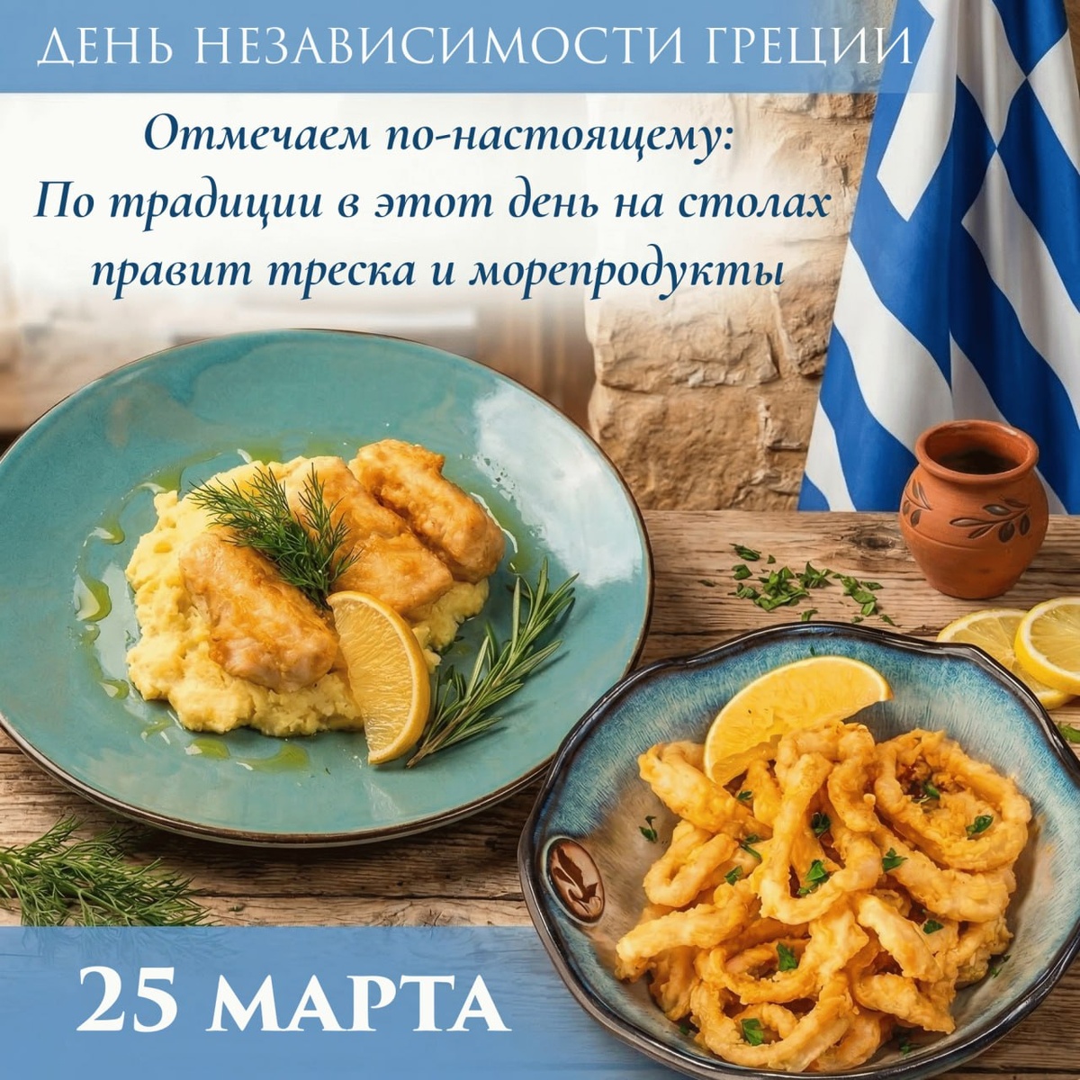 ! 🌊 25 марта вся Греция отмечает важнейший праздник - День независимости. И если вы спросите любого грека, чем пахнет этот день, он не задумываясь ответит: жареной треской и морем! По традиции именно в этот день на каждом праздничном столе правят бал морепродукты. Мы в таверне Порто Миконос решили, что такую вкусную традицию нельзя пропускать! Специально к 25 марта мы приготовили для вас настоящие хиты греческих застолий: 🐟 Бакалярос скордаля: нежнейшее филе трески в безупречно хрустящем воздушном кляре. Тот самый вкус, переносящий прямо в шумные таверны Эгейского моря! 🦑 Каламаракя тиганита айоли: золотистые кольца кальмара, обжаренные до идеального хруста, в паре с шелковистым соусом айоли. Оторваться просто невозможно! Приглашаем вас разделить этот день с нами, прочувствовать дух настоящей Эллады и насладиться любимыми вкусами греков. Опа! 🍷 Забронировать столик можно на сайте portomykonos.ru или по телефону ☎️ +74996382690 Греческий ресторан Таверна Порто Миконос. 🇬🇷🇬