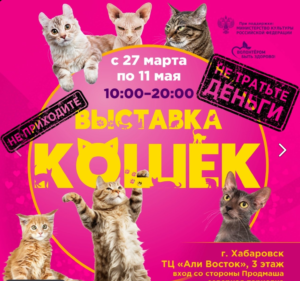 ✔ Экспозиция с популярными и редкими породами кошек. ✔ Мейн-куны, сфинксы, бенгалы, экзоты и другие. ✔ Возможность понаблюдать за питомцами и сделать фото. ✔ Подходит для семейного отдыха с детьми. ✔ Формат свободного посещения в течение дня. 📅 Когда: #27_марта — #11_мая, 10:00–20:00 ⛳ Где: ТЦ «Али Восток», пр-т 60-летия Октября, 156, Хабаровск 💳 Стоимость: 500–600 ₽ (до 3 лет — бесплатно) Подпишись на случай, если заблокируют Телеграм👉 MAX