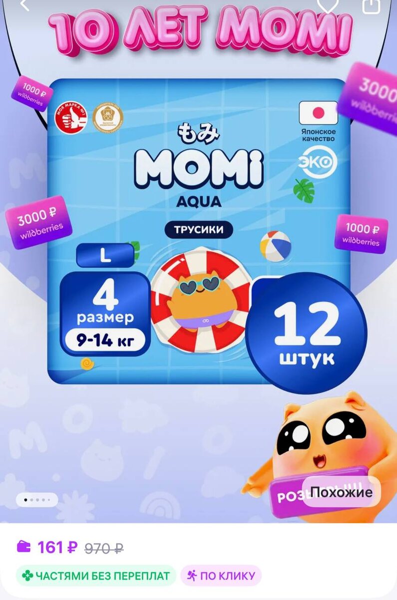 MOMI Подгузники трусики для плавания AQUA 4 размер L 9-14 кг 12 ш…