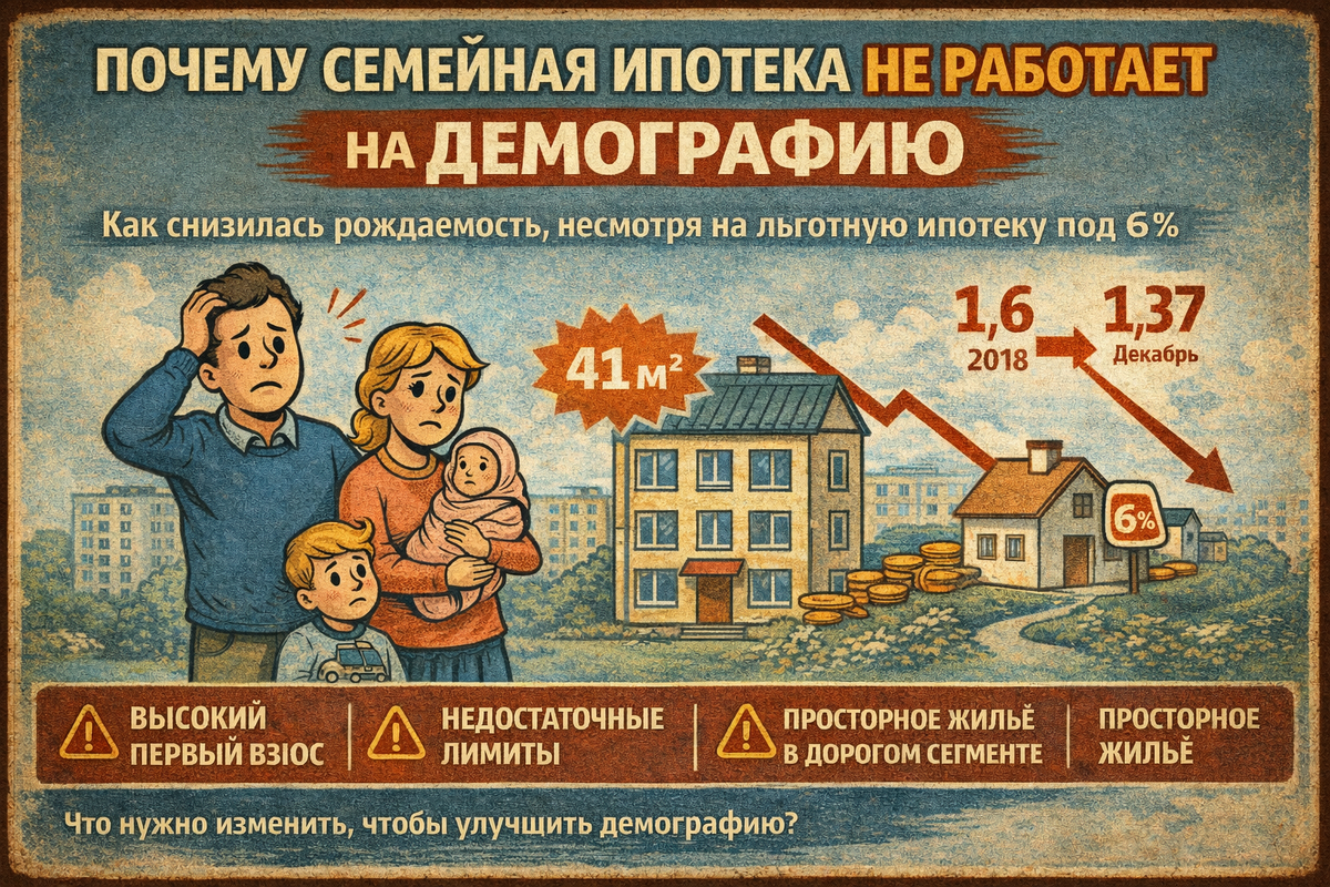Несмотря на попытки властей увеличить рождаемость за счёт льготной ипотеки под 6%, каждый год коэффициент рождаемости в России снижается: с 1,6 в 2018 году до 1,37 в декабре 2025. Почему? Чтобы накопить на первоначальный взнос (20%) для покупки новостройки площадью 65 м², в среднем нужно около 6 лет. К слову, в 2019 году на эти цели требовалось лишь 2,3 года. Поэтому средний возраст заёмщика льготной ипотеки растёт — сейчас это 35 лет (+1 год за последние пять лет). К моменту, когда жильё наконец куплено (30–40 лет), репродуктивный потенциал семьи для рождения второго и последующих детей снижается. Отсюда и тренд на увеличение возраста матери при рождении первенца. По социальным нормам семья из трёх человек должна жить в квартире площадью от 54 м², если детей двое — 60–70 м². Но в реальности максимального лимита в 6 млн рублей для регионов хватает только на покупку однушки 41,1 м² в новостройке. Лишь в двух регионах по семейной ипотеке можно приобрести жильё, где получится разместиться
