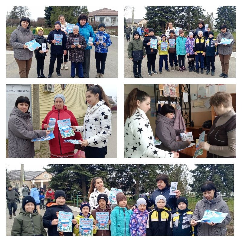 18 марта Греково-Тимофеевский СДК провёл акцию по раздаче листовок и буклетов «Мы – вместе, Россия и Крым, Севастополь». В этот день в стране отмечается важная дата — День воссоединения Крыма с Россией. Ровно 12 лет назад в Крыму прошел референдум, по результатам которого полуостров вошел в состав Российской Федерации. В результате референдума полуостров Крым официально вошел в состав Российской Федерации, а Республика Крым и Город-герой Севастополь получили статус субъектов Российской Федерации. Эти события были названы долгожданным возвращением домой. Из листовок и буклетов можно узнать о прошлом Крыма, о возращении его в состав России и многом другом. Греково-Тимофеевский СДК Н.Н. Чайкова