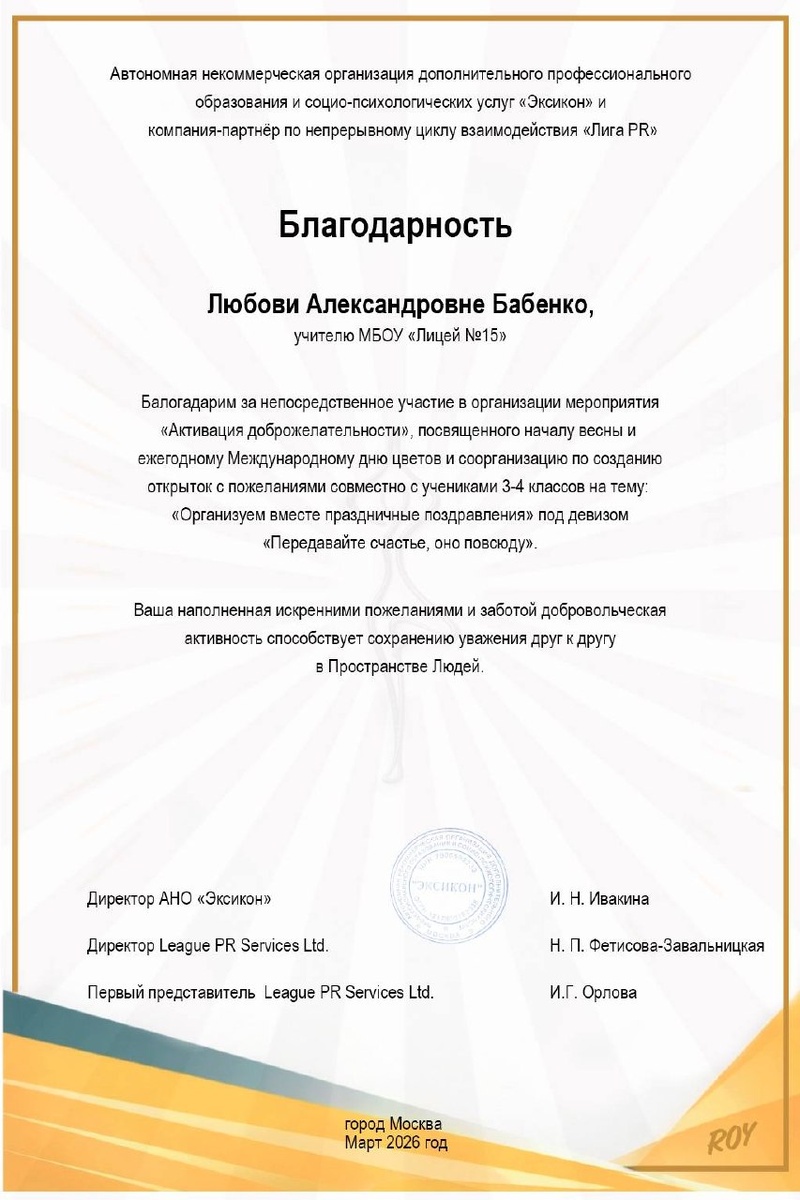 - 23.03.2026г. Где Первый Представитель и Амбассадор компании League PR services Ltd. Ирина Геннадьевна Орлова выступит перед детьми 3-4 классов и поделиться эмоциями, которые как соАвтор идеи и непосредственный организатор масштабной акции #улыбкадальше 2035-2030 гг. с целью сохранения традиций и ценностей, а также их в мирных целях в Пространстве Людей. В качестве признания по итогам завершения больших мероприятий для нас очень важно ещё и МЕСЯЧНЫЙ ГЕШТАЛЬТ - в марте мы уже подготоивли Письма с благодарностями лично тем, кто всесторонне либо поддерживал проект, либо сотрудничал и помогал, оставаясь незамеченным! Напоминаю, апрель — это уже сложившаяся практика прощения со дня основания миссии кАмпании в 2020 году и корпорации ROY как партнерской сети. Так уж заведено, что именно в апреле всё общество повсеместно относится ко многому под видом шуток, поэтому этот период был выбран «временем прощения». И лишь заинтересованный в своем непрерывном развитии и росте искренний Человек ч