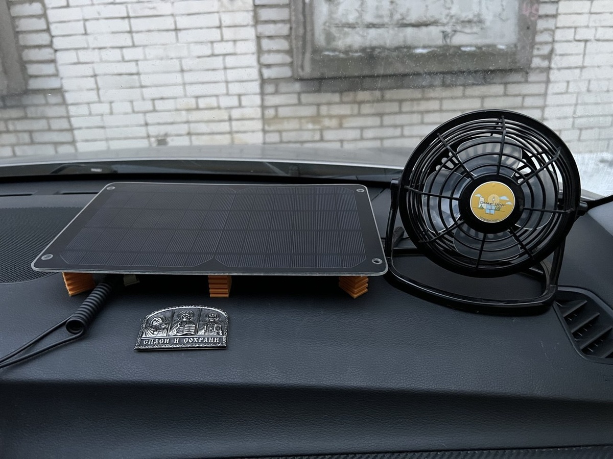 Долгое время у меня в машине «на соплях» лежала солнечная панелька с вентилятором и, когда у меня появился 3D-принтер, я активно занялся тем, чтоб всё стало аккуратно. Ну, в смысле, что раньше я постоянно подклеивал на панельку по несколько слоёв двустороннего скотча, потому что она – панель – плоская, а торпеда в машинах почти всегда криволенейная.