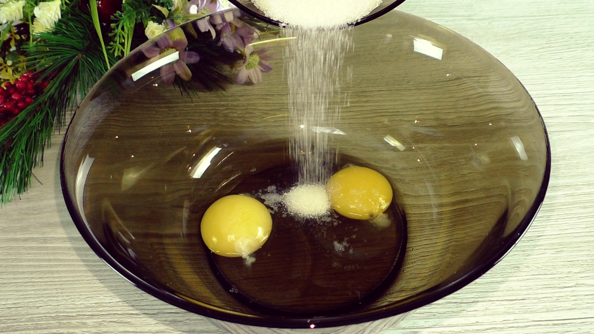 Смешиваем в миске яйца, соль и сахар. Сахара в тесто я много не добавляю, потому что будем готовить глазурь. Перемешиваем.