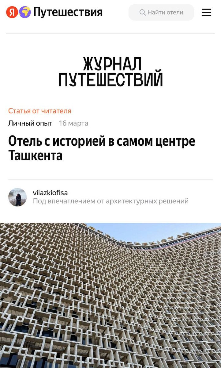 ! Забежала к вам с радостной новостью: мою заметку опубликовали в «Журнале Яндекс Путешествий» https://travel.yandex.ru/journal/otel-s-istoriey-v-samom-centre-tashkenta Вдвойне приятно, что труд вознаграждается — получила подарок: промокод на 5000 ₽ на будущие поездки🎒 Я убеждена, что у каждого из нас есть история, достойная публикации. Признавайтесь, делились ли вы своими впечатлениями в профильных медиа? 💬 Присылайте ссылки на свои работы! Буду искренне рада познакомиться с вашим творчеством ближе. #Ташкент #Узбекистан Вылазки офисного планктона