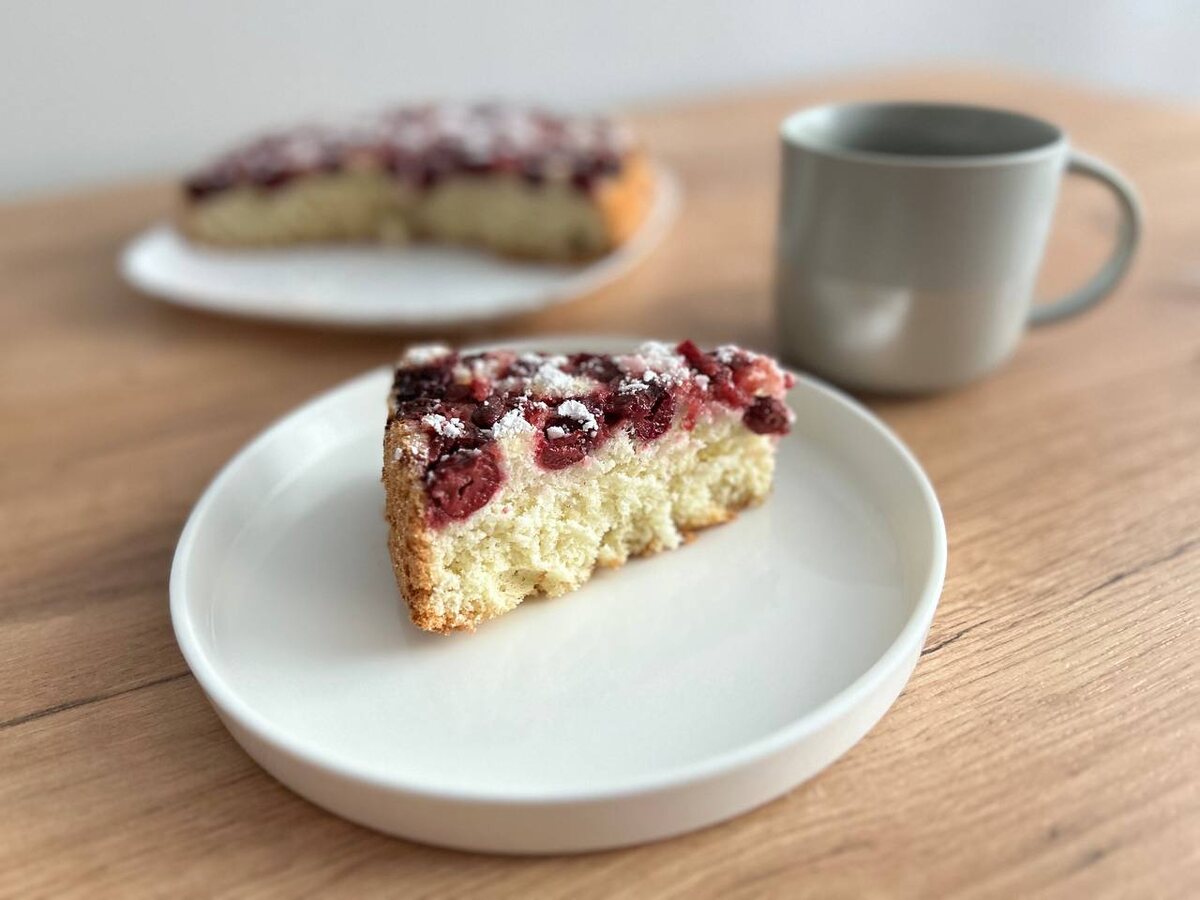 Я прошлым летом, когда замораживала домашнюю вишню, приготовила из неё шарлотку. Она мне так понравилась, что в следующий раз я решила обязательно снять процесс приготовления и поделиться им с вами) Вишня у меня была заморожена без косточек. Поэтому я размораживаю её и промакиваю от излишней влаги, чтобы при запекании у меня не поплыло тесто. Взбиваем яйца с солью в пену. Добавляем 1 ч.л. ванильного сахара и, продолжая взбивать яйца, параллельно всыпаем тонкой струйкой сахар. Взбивать миксером нужно на высокой скорости. Примерно через 2-3 минуты масса начинает белеть и густеть. В итоге, получаем светлую, пышную и достаточно густую массу, которая должна увеличиться в размере примерно в 3-4 раза. Просеиваем муку. Перемешиваем аккуратно силиконовой лопаткой снизу вверх, чтобы не было мучных комочков. Тесто будет гладкое и воздушное. На этом моменте уже можно включать духовку для разогрева. Выставляем температуру 180°. Дно разъемной формы (моя диаметром 24 см) выстилаем пергаменто