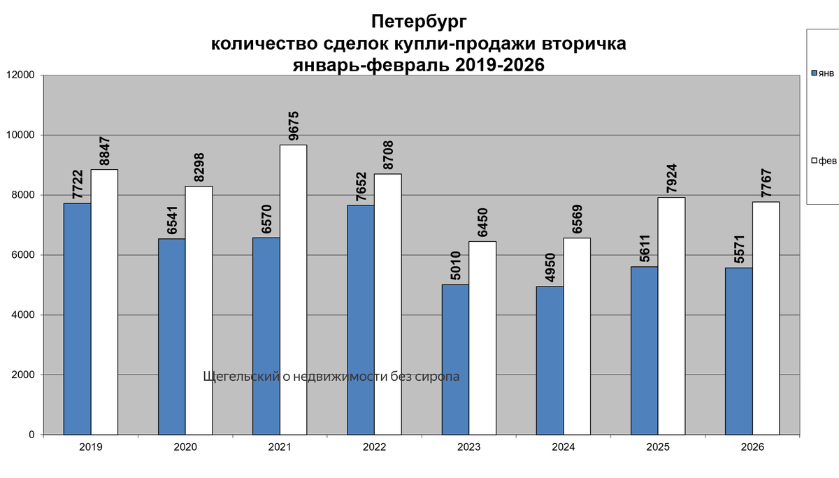Хотя спрос на вторичку в Петербурге примерно на 20% ниже уровней до февраля 2022 года (можно видеть количество регистрируемых сделок за январь-февраль с 2019 года в приложенном графике), но этого недостаточно, чтобы отправить цены вниз, т.к. количество предложений падает уже несколько лет подряд. На втором графике видно, что год назад продавалась каждая 3,3 квартира, а в феврале этот показатель достиг 2,64, что на 20% отличается от параметров годовалой давности. Следовательно, для снижения цены необходимо, либо снижение спроса на 20-30%, либо увеличение предложения на те же 20-30%.